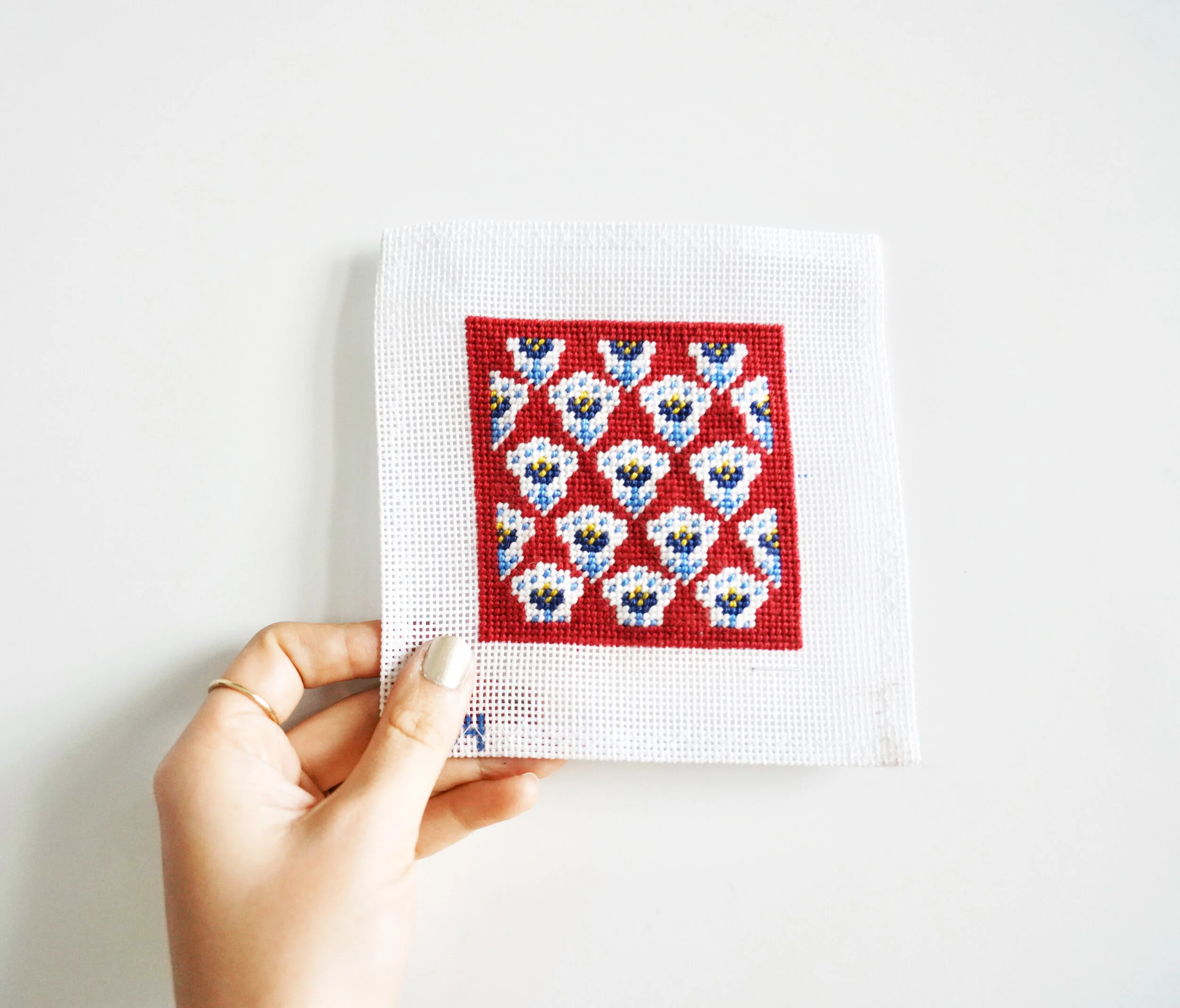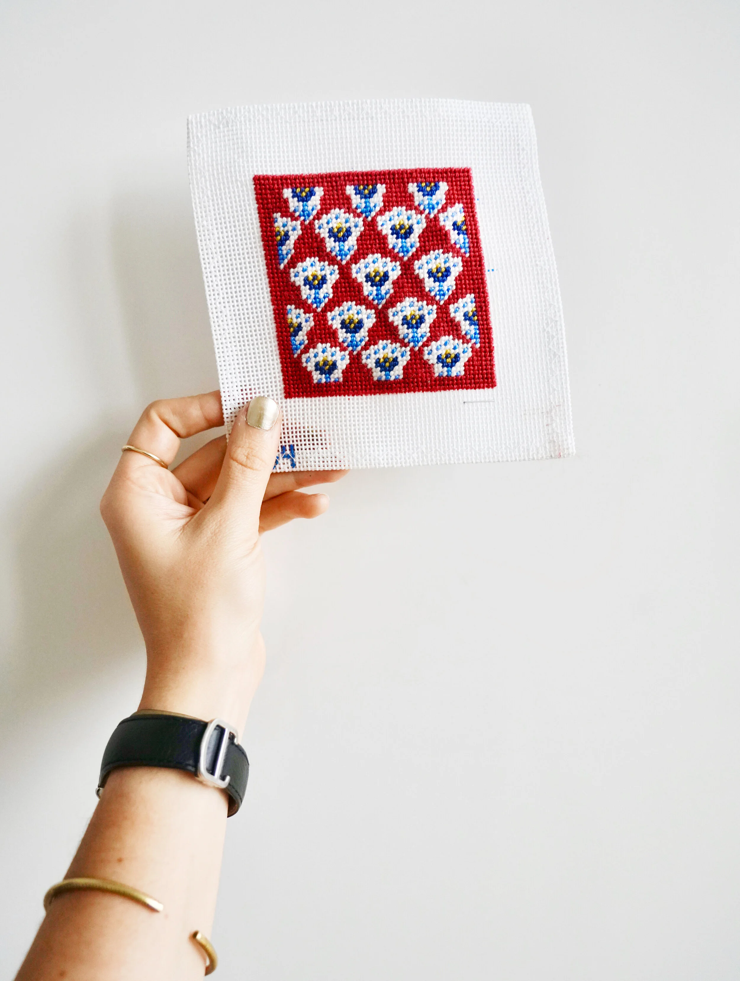 While flipping through canvases and catching up with Maria Timmerman of In Stitches Fine Needlepoint in Dorset, I found a copy! With the pursuit to stitch as many needlepoint ornaments as I can in 2020, I let fate take over and added it to my collection. It was the perfect project to travel with due to it’s small size and limited color palette- loved stitching this on the plane to Tanzania, watching a film about Indian Block Printing techniques.