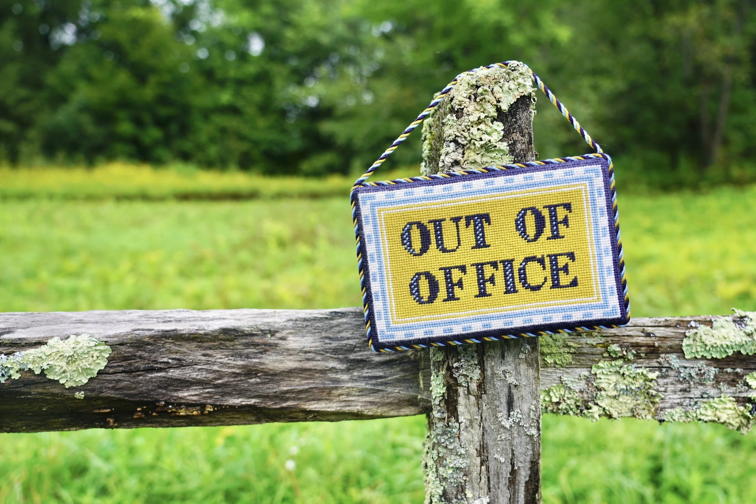 Whether you hang it in your office to notify your collaborators that you’re on holiday or to remind yourself to unplug, this simple canvas is a fun, quick stitch and easy to travel with.