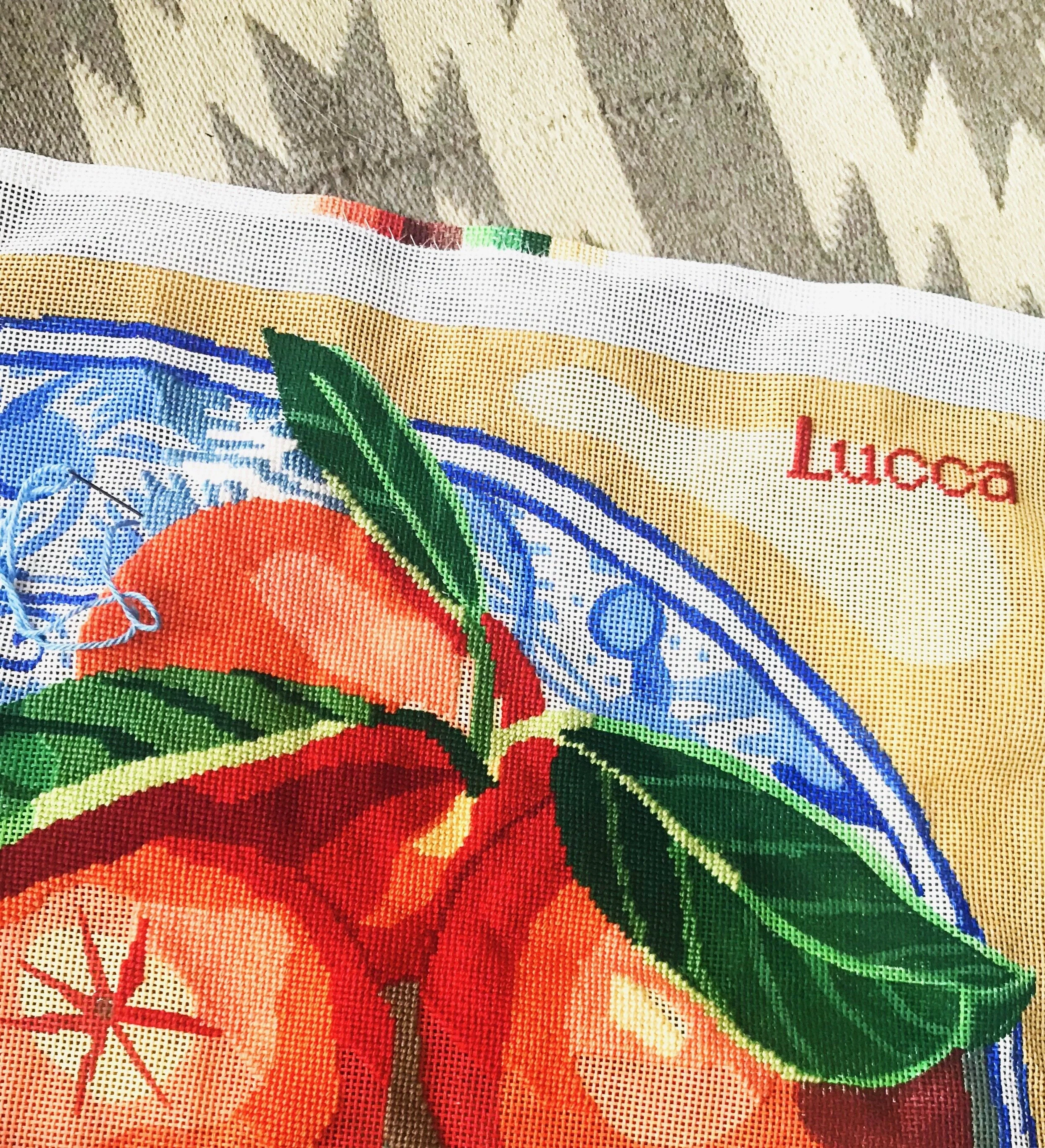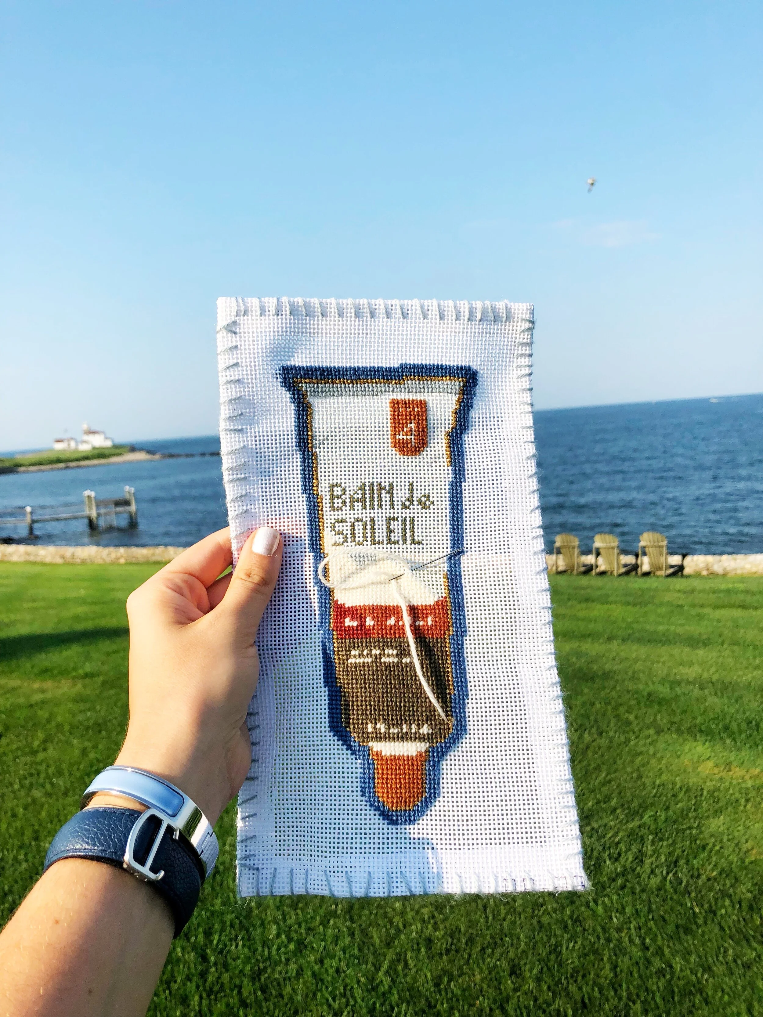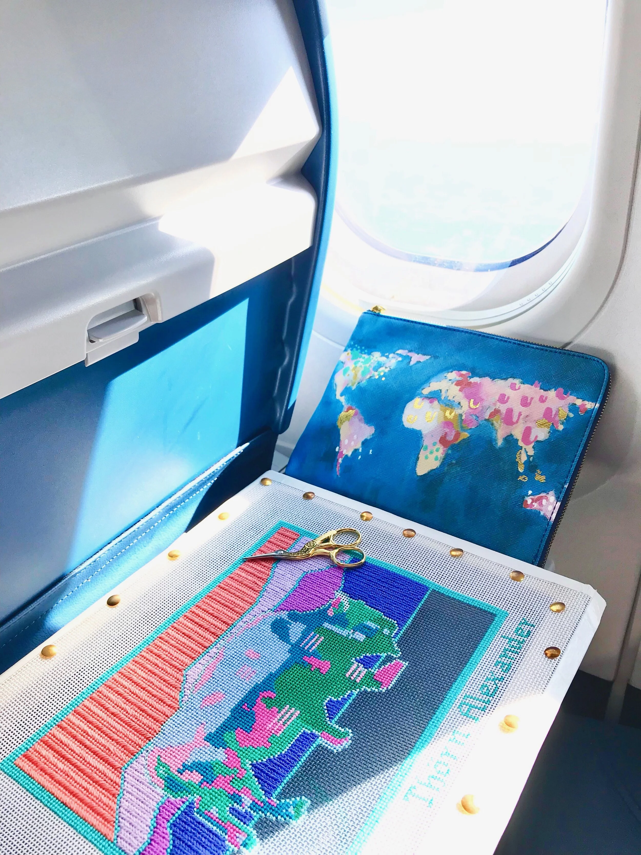 Needlepoint not only brings me peace, relaxation and happiness, it is such a beautifully efficient way to rid anxiety from traveling and have a piece to mark such an adventure.