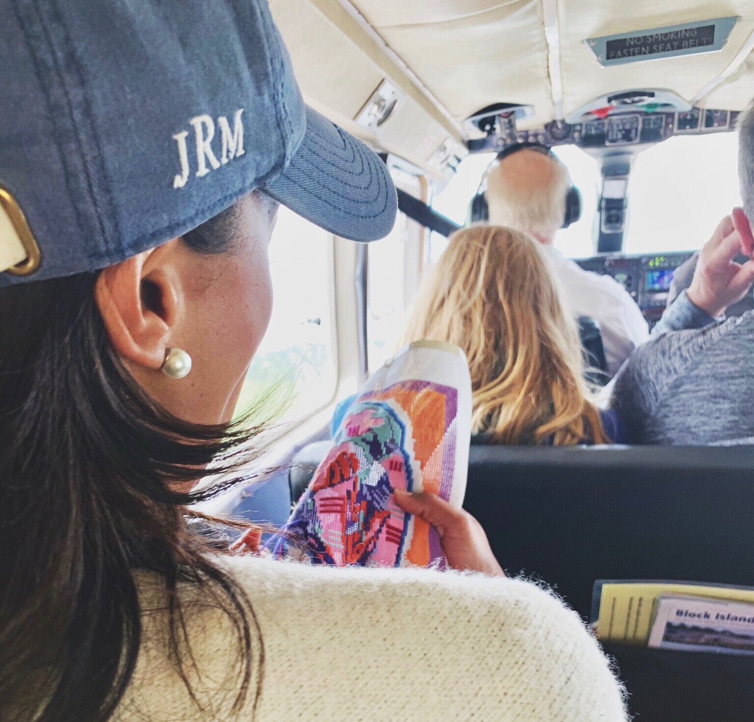 Dear friend, Jess Radford stitching on flight to Nantucket