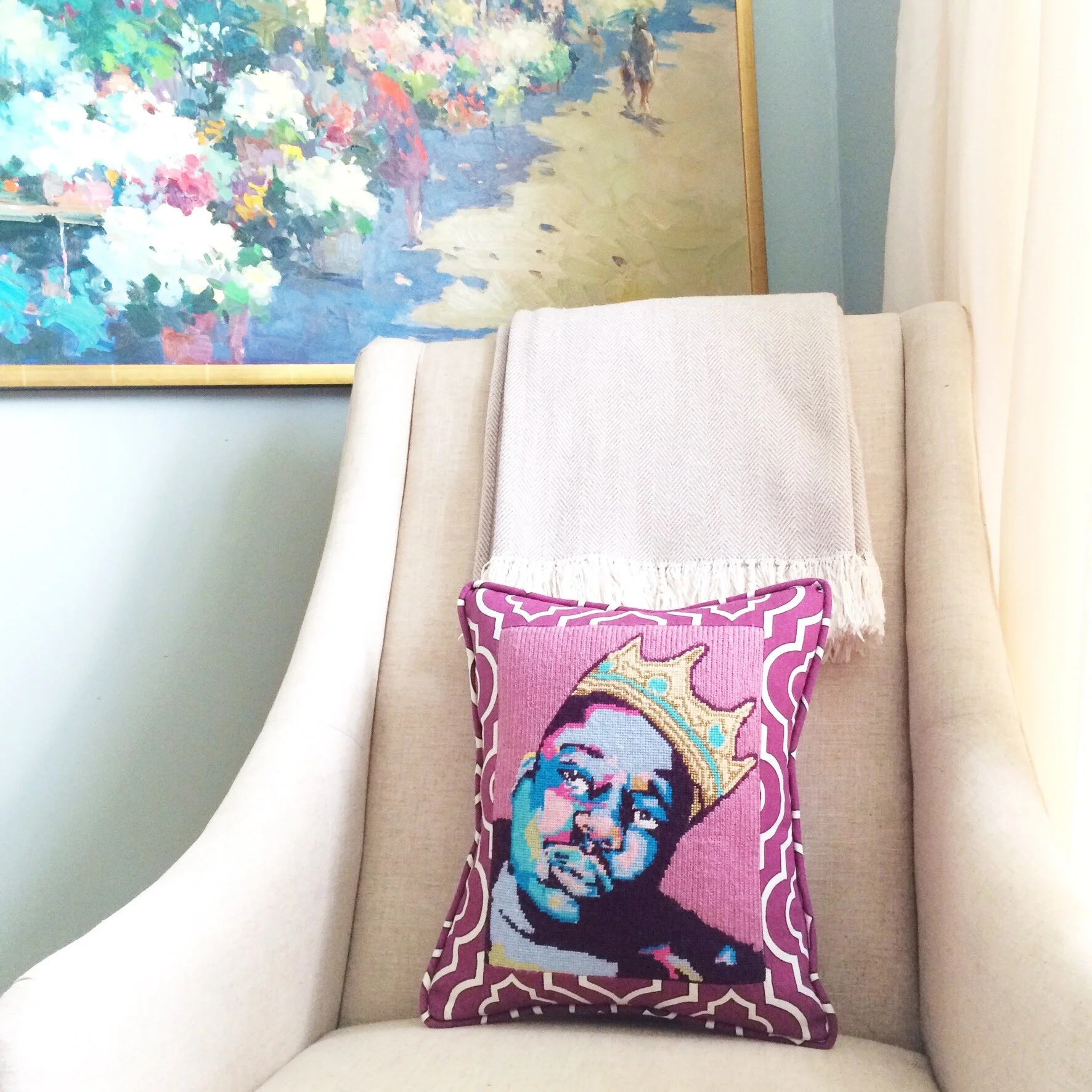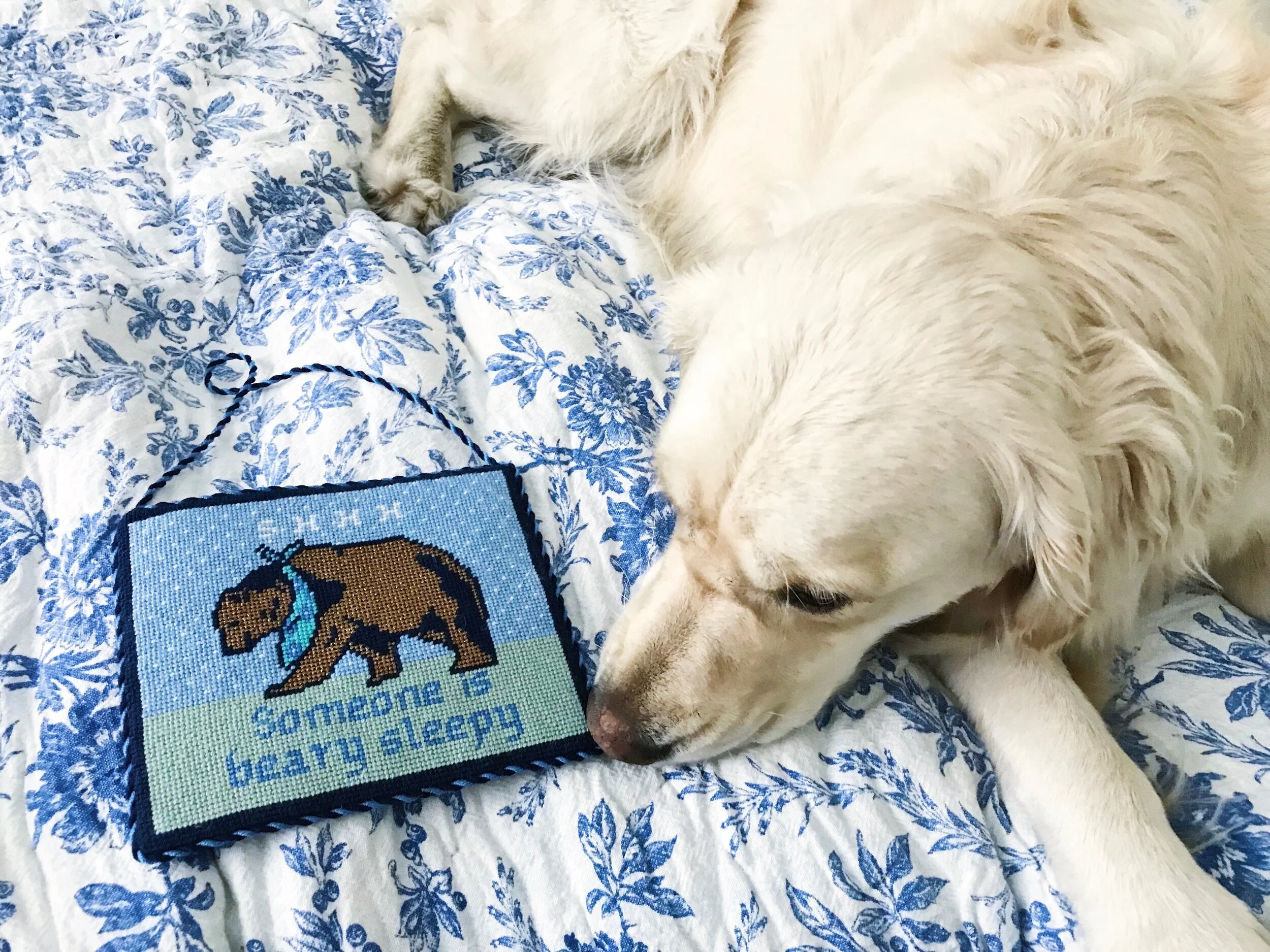 My very first needlepoint design. This pillow was sold shortly after this photo was taken to a gentleman in Greenwich, CT. I used the money to buy more canvas and start the foundations of my business.