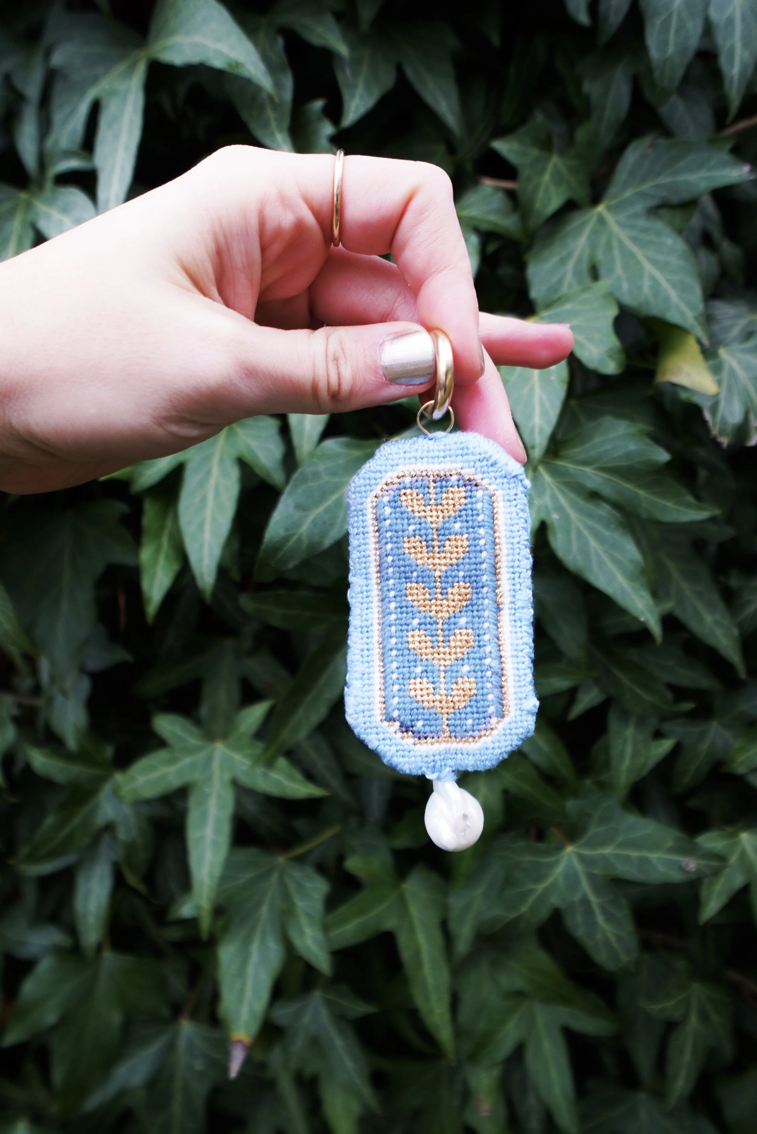 In a true Vermeer fashion, I decided to create a nod to The Girl With The Pearl Earring in a way that exaggerated form and included needlepoint. Baroque pearls have been a favorite of mine for quite some time and I always find that my eye always seems to scan for them when I make my own purchasing choices. This versatile, reversible earring can act as a jacket for an existing pair of pearls, be hung from a hoop, or even worn as a brooch.