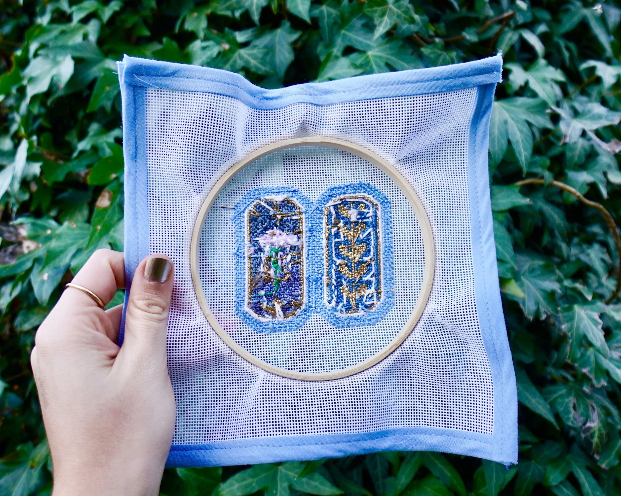 One one side of the needlepoint is a favorite symmetrical leaf motif that I have been including in my personal work for the last year. In Fyre Werks light gold, Vineyard Silk’s Gentleman’s Gray and Sky as well as Pepper Pot’s Salt, I stitched this side to emulate a serene, soothing palette that would have been popular in the rococo era.
